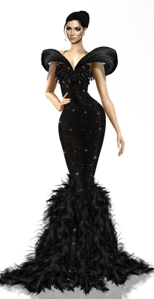 • Natural Feather Train: The dress’s finish is a spectacle in itself. Hundreds of natural ostrich feathers, dyed in intense black, are applied manually to create volume, movement, and that “floating” effect when you step.