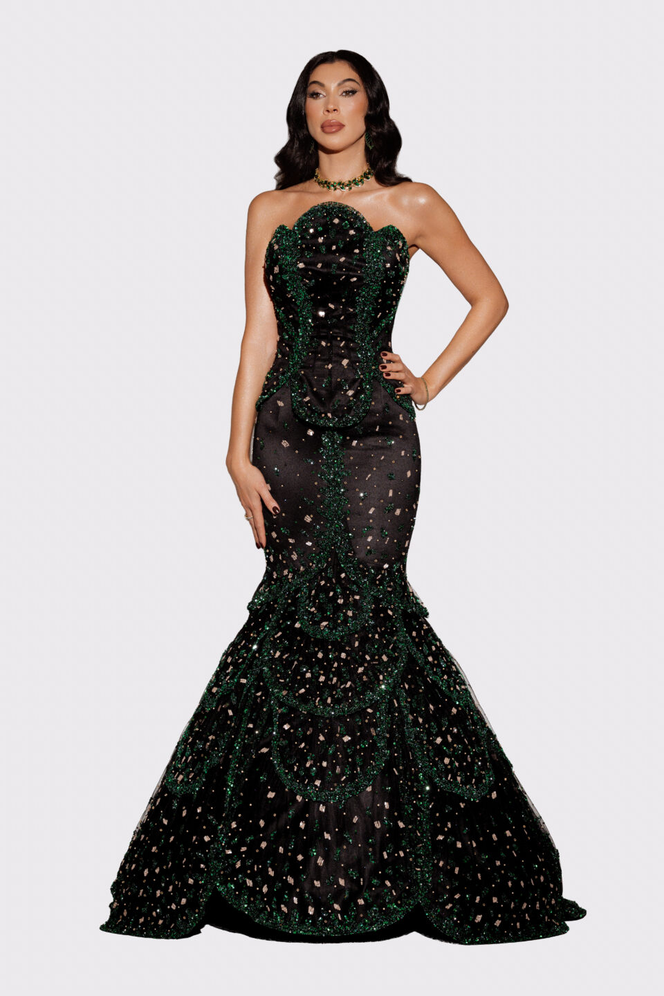 Dramatism meets absolute refinement in the ‘Midnight Muse’ dress. An avant-garde creation that sculpts the body into a perfect mermaid silhouette, covered in waves of black crystals. The architectural details on the shoulders and the explosion of natural feathers at the base transform this dress into a gothic-glam jewel, created to stop time.